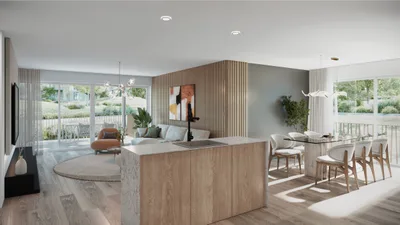 Résidence implantée au cœur d’un parc verdoyant, offrant un environnement calme et privilégié avec des espaces communs soignés et des aménagements favorisant la mobilité douce. Appartements spacieux du studio au grand logement familial.