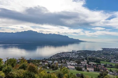 Vue panoramique spectaculaire sur la ville de Montreux et le bassin lémanique.